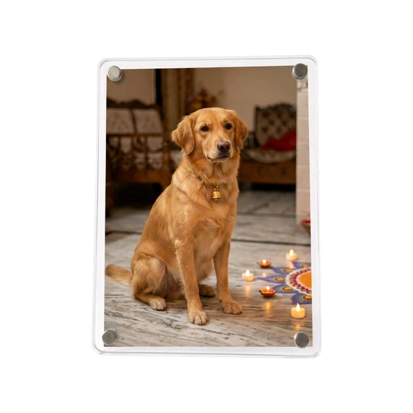 Crystal-clear acrylic frame with strong magnets and detachable easel stand. Displays photos or artwork on your fridge or tabletop.