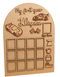 MDF arch-shaped memory board with 3D laser-cut cars, name, and 13 photo slots to display newborn to 12-month milestones.