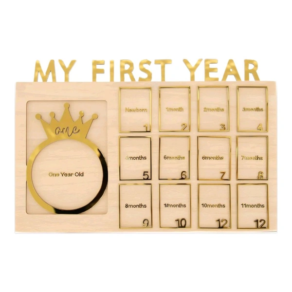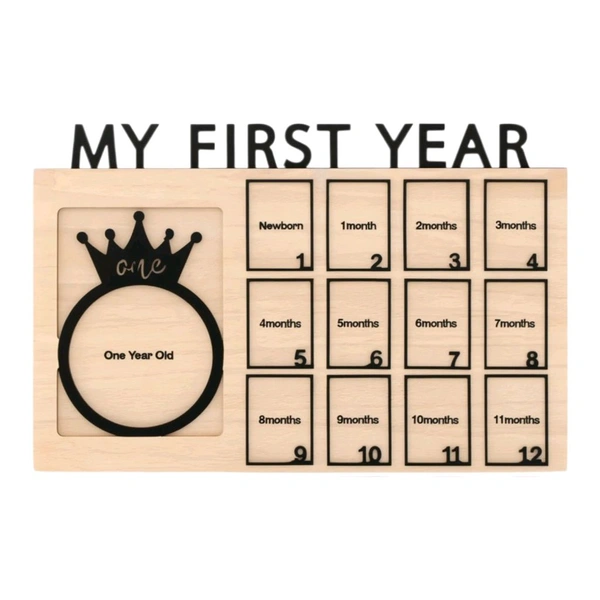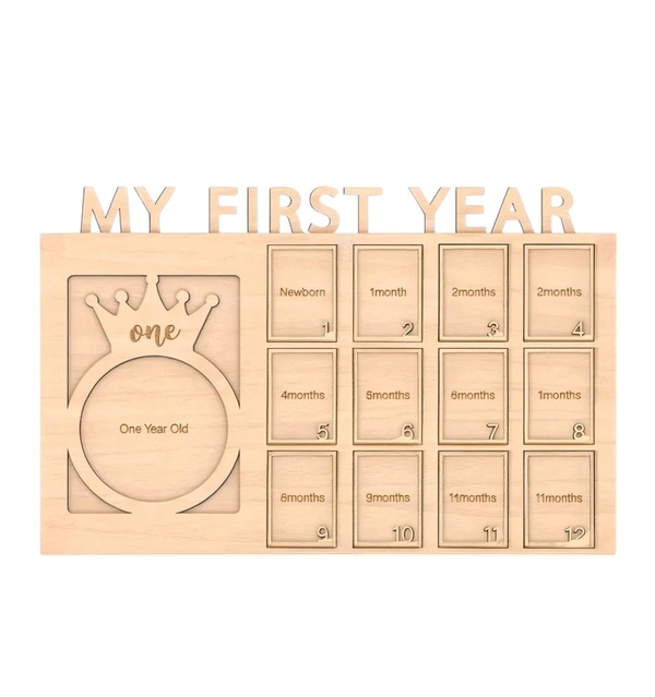 MDF arch-shaped memory board with 3D laser-cut cars, name, and 13 photo slots to display newborn to 12-month milestones.