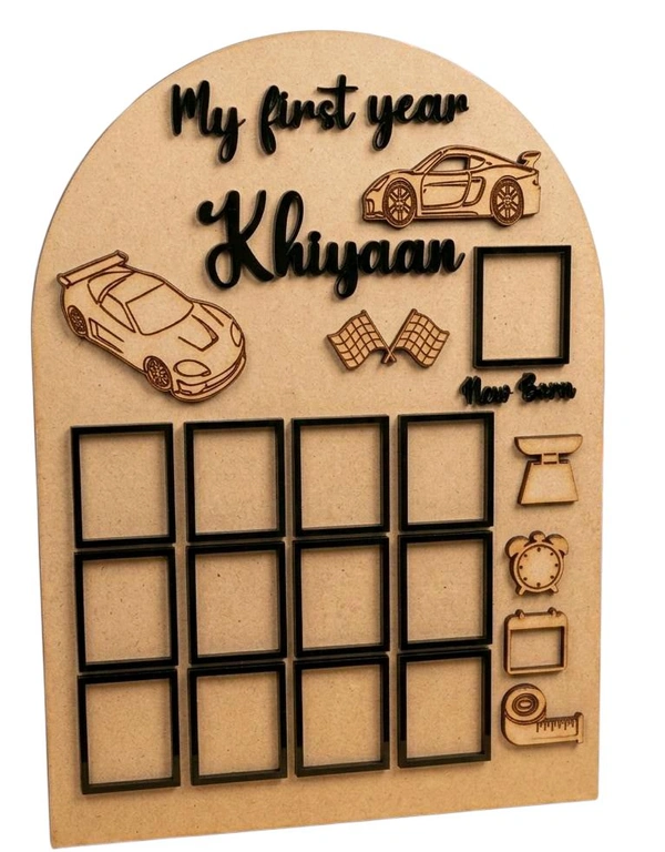 MDF arch-shaped memory board with 3D laser-cut cars, name, and 13 photo slots to display newborn to 12-month milestones.