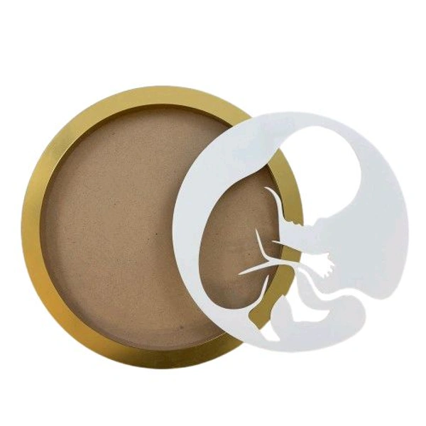 Round layered frame with gold mirror acrylic border, white MDF background, and natural MDF cutout of a baby in the womb. Ideal for pregnancy announcements, maternity photoshoots, or nursery wall decor.