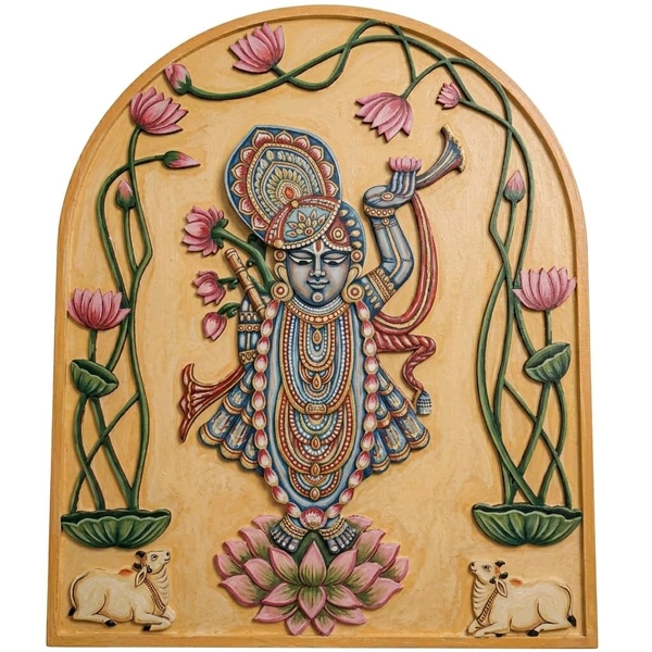 Detailed arched MDF panel of Shreenathji with lotus blooms, vines, and cows, crafted in traditional Pichwai style. Perfect for pooja decor, DIY painting kits, or devotional gifting.