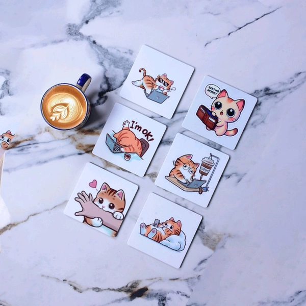 Premium Acrylic Tea Coasters UV Printed Set of 6 with Stand | Funny Cat