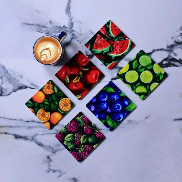 Premium Acrylic Tea Coasters UV Printed Set of 6 with Stand | Fruits