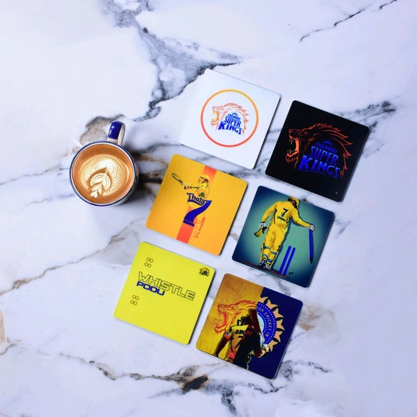 Premium Acrylic Tea Coasters UV Printed Set of 6 with Stand | CSK Cricket Theme