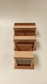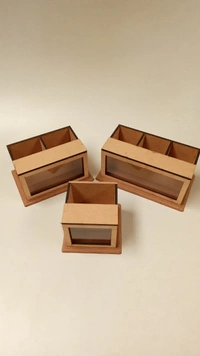 A beautiful and multipurpose organser , use it as pen stand cutlery stand or paint brush stand etc with shadow box in front of it to showcase your creativity in an amazing way. It has 3 partitions and an acrylic glass front with a frame to protect your precious artwork